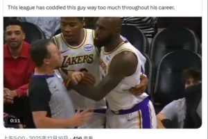 体育资讯12月16日讯 湖人昨日客场116-114险胜太阳,比赛中詹姆斯对裁判进行推搡和大喊大叫,但没有吃到技犯引起热议。