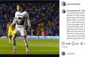 墨西哥美洲狮与拉姆塞解约,拉姆塞社媒写道:“我想感谢墨西哥人民对我的友善与慷慨,让我和我的家人在墨西哥城感受到如此温暖的欢迎。我还要特别感谢主教练、教练组,尤其是医疗团队,在我受伤的艰难时期给予我的帮助。在他们的支持和努力下,我恢复了状态,为接下来的比赛做好了准备,期待为美洲狮贡献自己的最好表现。”