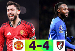 #曼联4比4伯恩茅斯# #B费任意球破门# #英超联赛#英超第16轮最后一场比赛,曼联再次在老特拉福德踢出一场疯狂的比赛,4-4战平伯恩茅斯,双方都试过比分领先,都试过扳平比分,都有任意球破门,精彩!第13分钟:迪亚洛头球补射空门,1-0!第40分钟:塞梅约抽射破门,1-1!第45+4分钟:卡塞米罗接应角球,后门柱头槌破门,2-1。第46分钟:伊万尼尔森劲射死角,2-2!第52分钟:塔弗尼尔直接任意球破门,2-3,球队首次领先!第77分钟:B费直接任意球破门,还以颜色,3-3!第79分钟:库尼亚中路推射破门,4-3,曼联看到赢球希望!第84分钟:克鲁皮禁区内推射得手,4-4!下半时补时长达10分钟,双方再无建树!