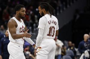 上半场比赛,骑士后场双枪米切尔和加兰发挥不错,进攻端里突外投都效率在线,其中米切尔12中6,三分7中4,罚球2中2砍下18分3篮板5助攻;加兰10中6,三分4中3,罚球2中2拿到17分3篮板4助攻1抢断。