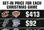 圣诞大战各场次比赛最便宜的门票价格。其中尼克斯主场最低票价为413刀、而雷霆主场最便宜的票价为92刀。
