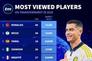 体育资讯12月26日讯 德国转会市场统计了2025年球员信息页面的浏览量,并列出排名,C罗、梅西、亚马尔前三。