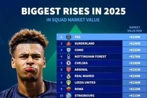 2025俱乐部身价涨幅榜:巴黎+3.38亿领跑,车枪皇分列5到7位