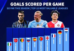 德转统计了本赛季欧洲前十联赛场均进球榜。