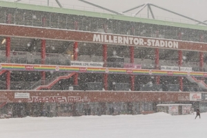 周五上午,情况变得越来越明朗。汉堡周四已经下了大雪,而从周五早上开始,暴风雪“艾莉”加剧了雪情。米勒门球场周围一片雪白,部分地区甚至出现了积雪。