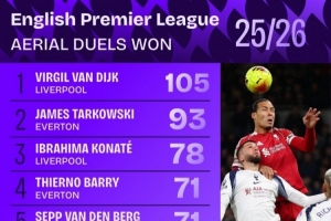 体育资讯1月10日讯 Squawka统计了本赛季球员在英超成功争顶的次数,并列出榜单,范戴克105次居首,而且他77.2%的争顶成功率也是英超最高(至少尝试25次)。